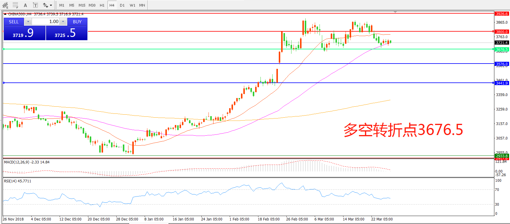 4小时图看,中华指数CHINA300高位盘整后出现大幅回落,整体走势陷入盘整,短期均线系统被跌破,55均线成为下一支撑, MACD红柱减少,RSI指标拐头向下,延续下行概率较大。