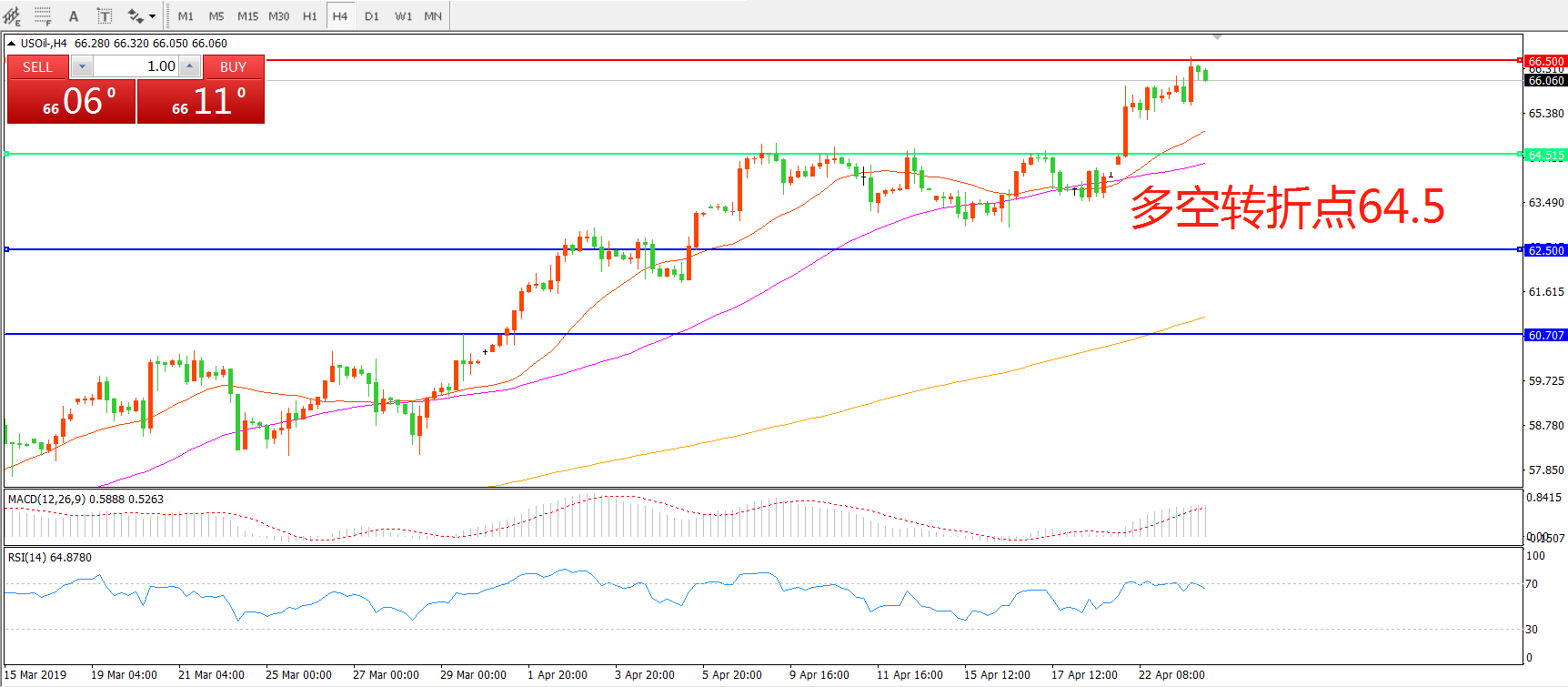 4小时图看,油价连续上升,触碰66.5阻力震荡回落,21均线逐渐上行成为支撑,短期走势偏强,均线系统呈多头排列,MACD红柱减少,RSI指标向下,日内有回调可能,但仍以多头思路为主。