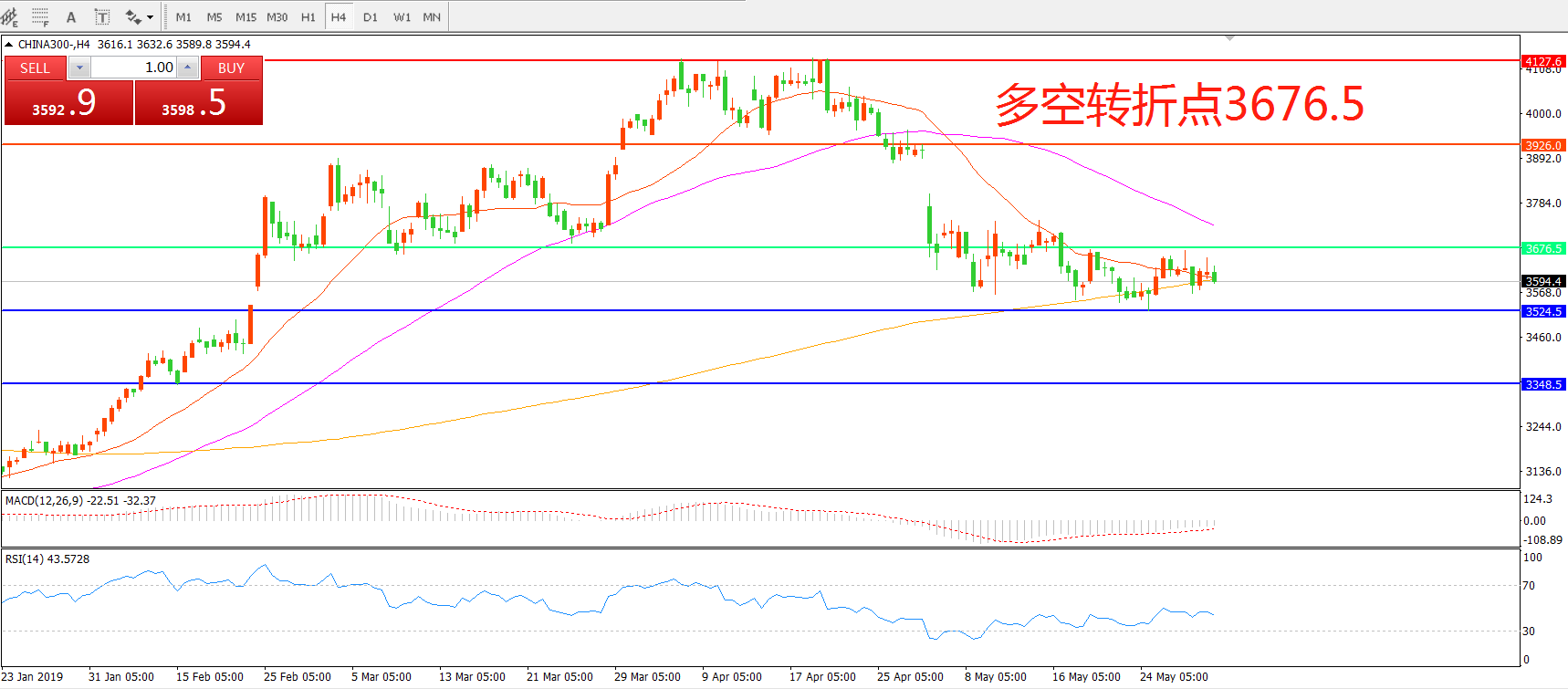 4小时图看,沪深300指数在跌破3676.5后陷入震荡走势,振幅逐渐收窄, 200均线成为短期支撑,MACD绿柱缩短,RSI指标拐头向下,日内以震荡下行思路对待。