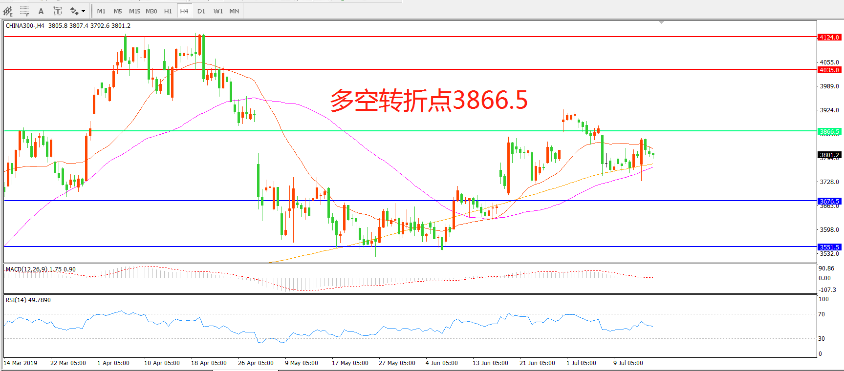 4小时图看,沪深300指数延续震荡下行,均线系统粘合形成上方阻力,MACD红柱缩短,RSI指标走平,日内震荡下行较大。