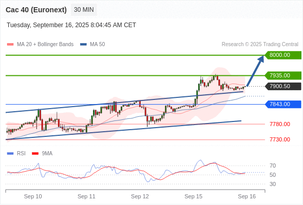 法国CAC指数期货 (Euronext) (U5) 当日内: 看涨。