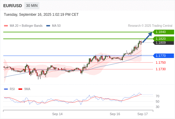 在 1.1770 之上,看涨,目标价位为 1.1820 ,然后为 1.1840 。