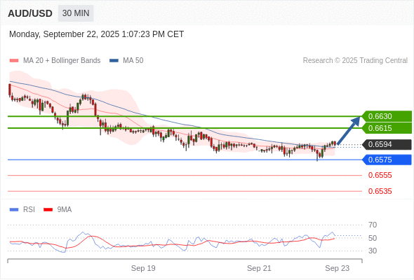 在 0.6575 之上,看涨,目标价位为 0.6615 ,然后为 0.6630 。
