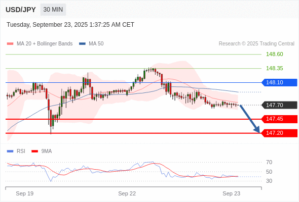 在 148.10 之下,看跌,目标价位为 147.45 ,然后为 147.20 。