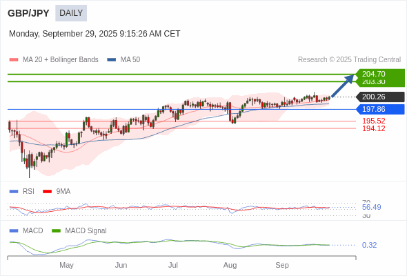 英镑/日元 短线 : 看涨,当 197.86 为支撑位,目标定在204.70。