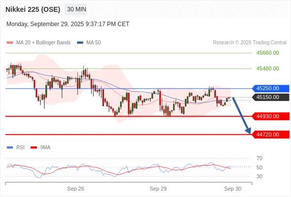 在 45250.00 之下,看跌,目标价位为 44930.00 ,然后为 44720.00 。