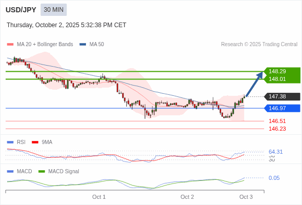 美元/日元 当日内 : 看涨,当 146.97 为支撑位。