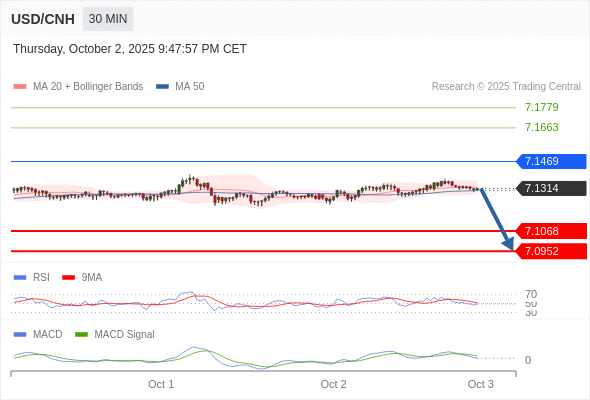 备选策略: 向上突破 7.1469 ,将带来继续上行的趋势,目标位定在 7.1663 和 7.1779 。