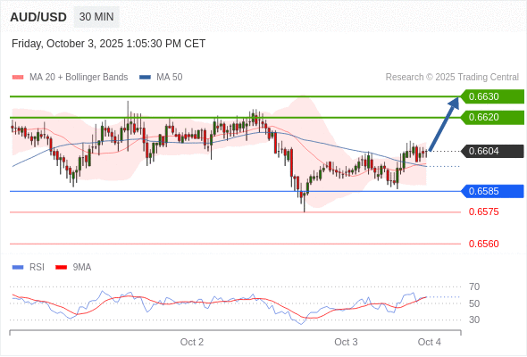 在 0.6585 之上,看涨,目标价位为 0.6620 ,然后为 0.6630 。