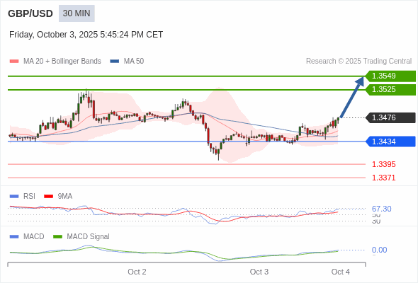 英镑/美元 当日内 : 看涨,当 1.3434 为支撑位。