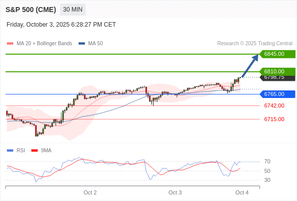 在 6765.00 之上,看涨,目标价位为 6810.00 ,然后为 6845.00 。