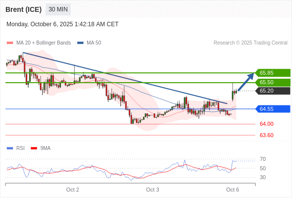 在 64.55 之上,看涨,目标价位为 65.50 ,然后为 65.85 。