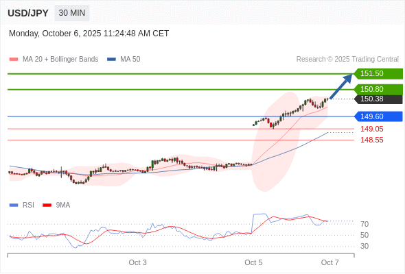 在 149.60 之上,看涨,目标价位为 150.80 ,然后为 151.50 。