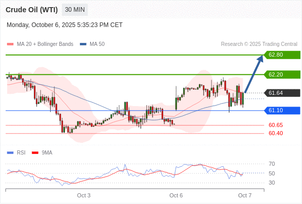 在 61.10 之上,看涨,目标价位为 62.20 ,然后为 62.80 。