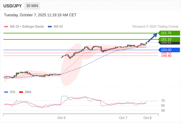 在 150.00 之上,看涨,目标价位为 151.10 ,然后为 151.75 。