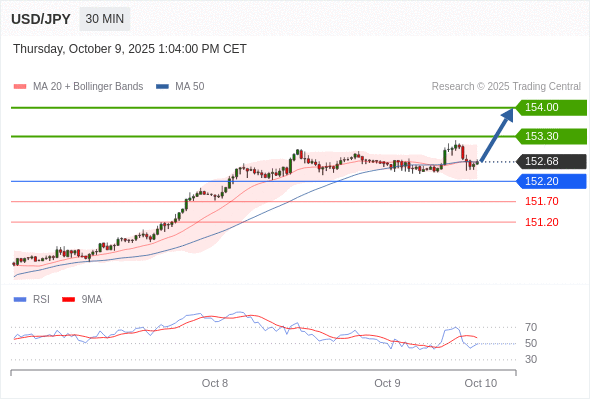 在 152.20 之上,看涨,目标价位为 153.30 ,然后为 154.00 。