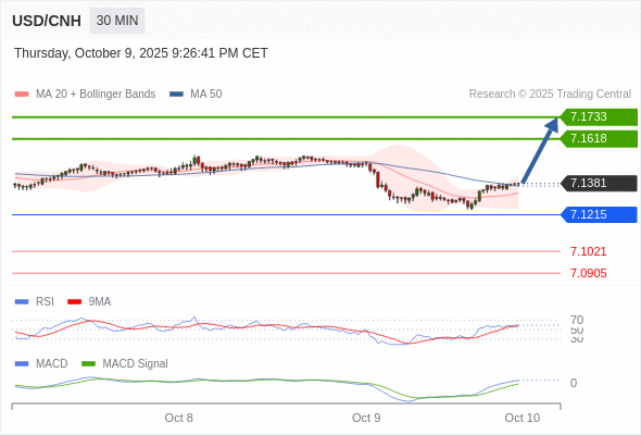 备选策略: 如跌破 7.1215 ,USD/CNH 目标方向定在 7.1021 和 7.0905 。