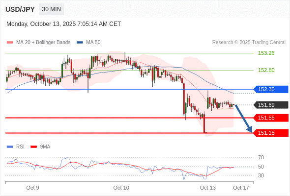 在 152.30 之下,看跌,目标价位为 151.55 ,然后为 151.15 。