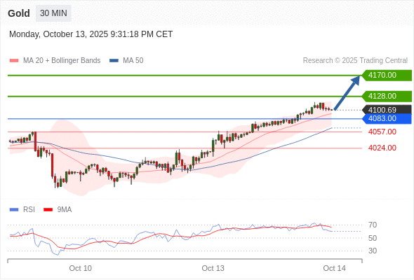 在 4083.00 之上,看涨,目标价位为 4128.00 ,然后为 4170.00 。