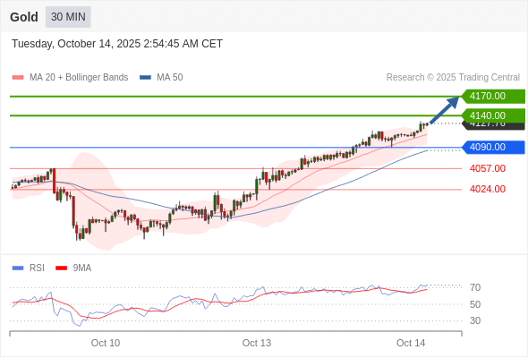 在 4090.00 之上,看涨,目标价位为 4140.00 ,然后为 4170.00 。