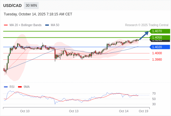 在 1.4020 之上,看涨,目标价位为 1.4050 ,然后为 1.4070 。