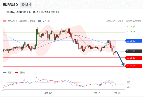 在 1.1590 之下,看跌,目标价位为 1.1540 ,然后为 1.1515 。