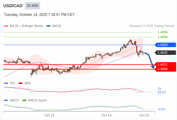 美元/加元 当日内 : 看跌,在 1.4063 之下。