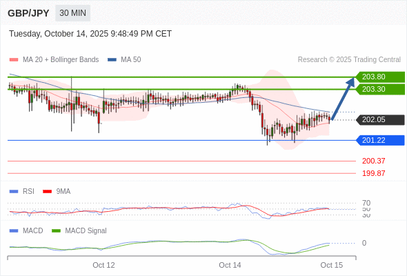 英镑/日元 当日内: 有上涨的可能,目标价位定在 203.80 。