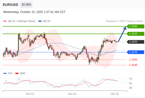 在 1.1575 之上,看涨,目标价位为 1.1625 ,然后为 1.1645 。