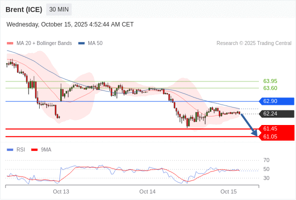 布伦特原油 (ICE) (Z5) 当日内: 短期关键阻力位在62.90。