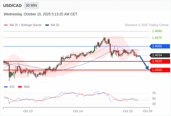 交易策略: 在 1.4055 之下,看跌,目标价位为 1.4020 ,然后为 1.4000 。
