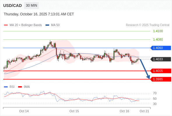 在 1.4060 之下,看跌,目标价位为 1.4005 ,然后为 1.3985 。