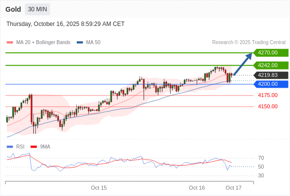 在 4200.00 之上,看涨,目标价位为 4242.00 ,然后为 4270.00 。