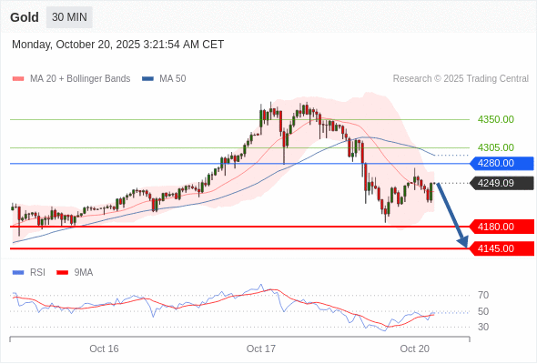 在 4280.00 之下,看跌,目标价位为 4180.00 ,然后为 4145.00 。