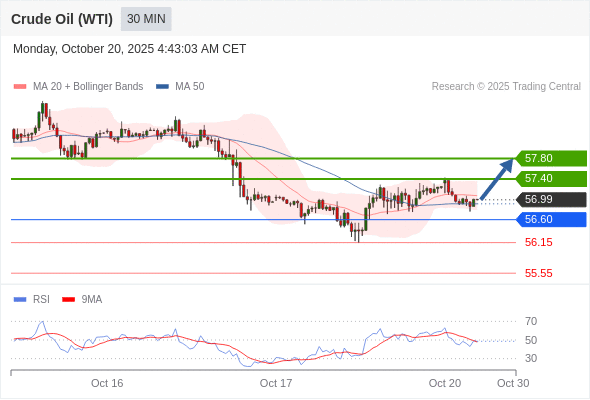 在 56.60 之上,看涨,目标价位为 57.40 ,然后为 57.80 。