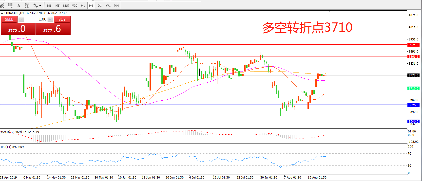 4小时图看,沪深300指数维持窄幅震荡,均线系统走平,形成下方支撑,MACD红柱减少,RSI指标向上,日内延续上行概率较大。