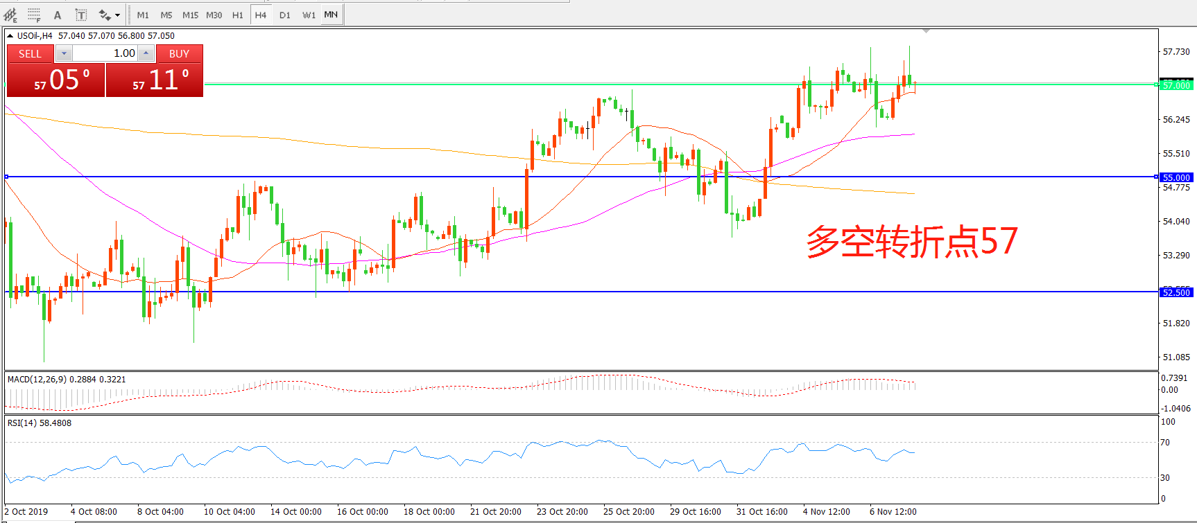 4小时图看,油价围绕57美金附近震荡反弹,处于明显的上行趋势中,均线系统走平,MACD红柱减少,RSI指标走平,日内油价延续震荡概率较大。