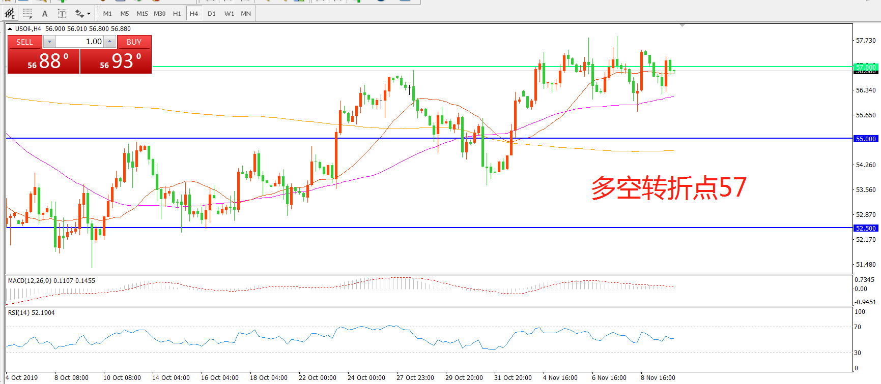 4小时图看,油价延续高位震荡走势,57美金成为多空争夺焦点,短期看多头仍然占据主动,均线系统走平,MACD红柱减少,RSI指标向下,日内油价延续震荡概率较大。