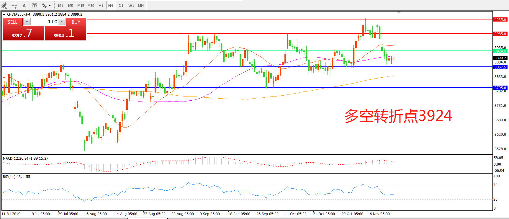 4小时图看,沪深300整体走势震荡偏弱,3867.5成为短期支撑,3924成为上方阻力,均线系统走平,MACD红柱减少,RSI指标走平,日内延续下行概率较大。