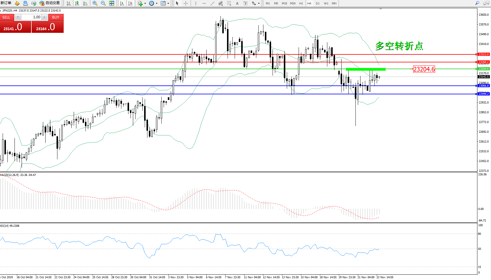 日经225指数11月22日(周五)收盘上涨85.42点,涨幅0.37%,报23124.00点。日本发布PMI数据,显示日本PMI综合指数升至48.6,表明日本第四季度GDP收缩的可能性很大。由于增税的影响,日本的工业产出和零售额可能大幅下滑。通胀数据显示,本月销售税上调对物价影响不大,不太可能影响消费者支出。然而,核心通胀率仍远低于日本央行2%的目标。中央需要在较长时期内维持超宽松的货币政策。但即便如此,几乎没有证据表明,通过当前的刺激措施,通胀能够持续达到目标。