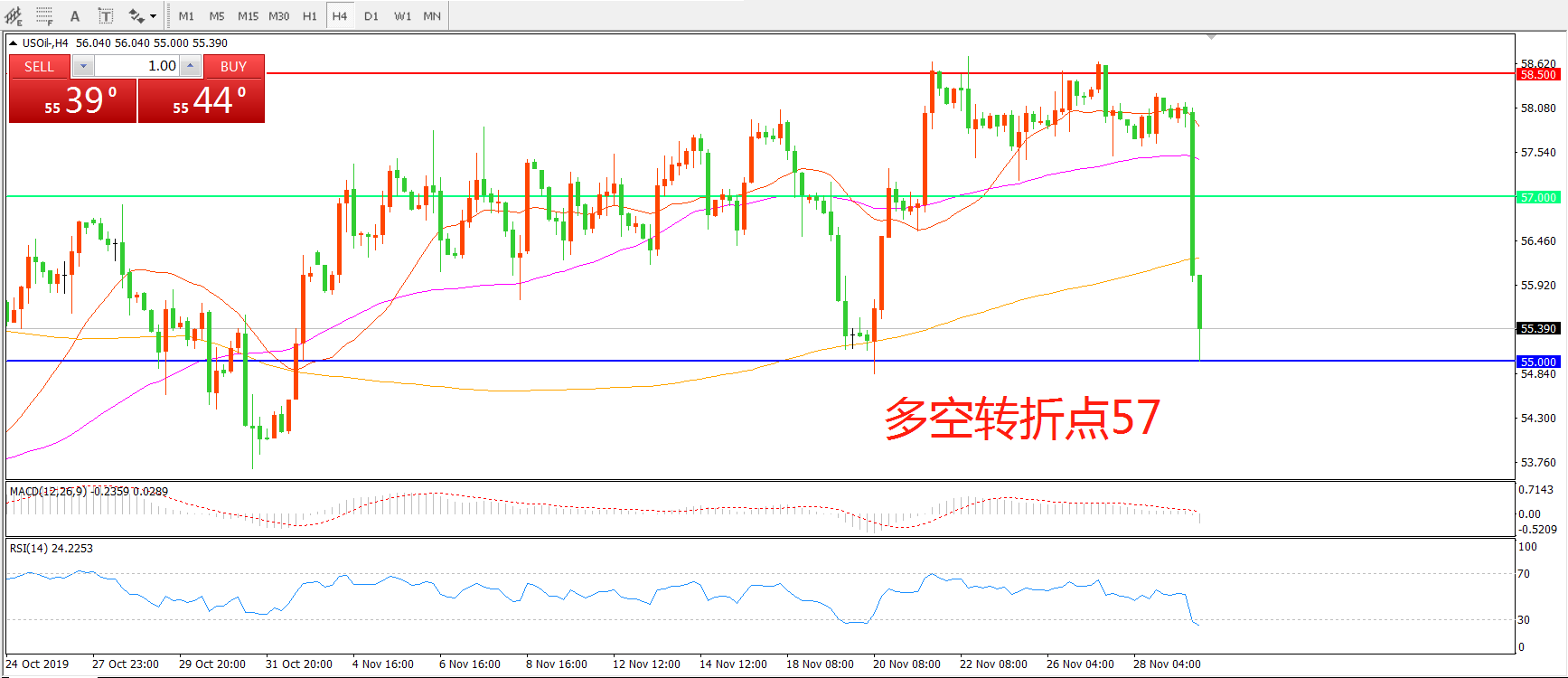 4小时图看,油价长阴下挫,上涨形态遭到破坏,200周期均线被跌穿,前期涨幅基本被吞没,55美元一线成为新的支撑,MACD红柱缩短,绿柱增加,RSI指标向下,日内下行概率较大。