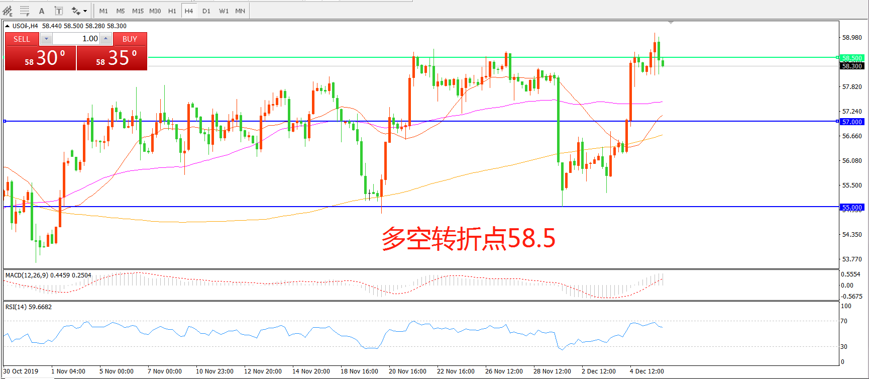 4小时图看,油价呈现冲高回落走势,显示58.5附近阻力小较强,整体走势偏多,均线系统走平,MACD红柱增加,RSI指标向下,58.5一线依然是短期多空分水岭。