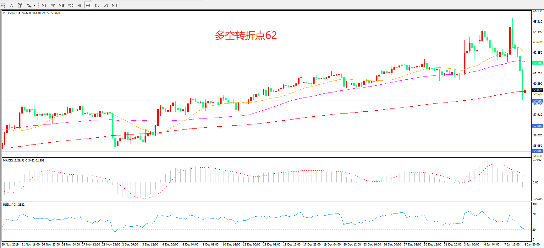周三(1月8日),伊朗向伊拉克的美军基地发射了10几枚弹道导弹,骤然升级的中东局势一度导致美油飙涨至65.61美元/桶,但晚间美国总统特朗普在讲话中表现温和,他强调,美国拥有强大的武力,但这不意味着美国会使用它,美国准备好与所有寻求和平的人一起拥抱和平。特朗普的讲话缓和了市场的紧张情绪,美油上演高台跳水。