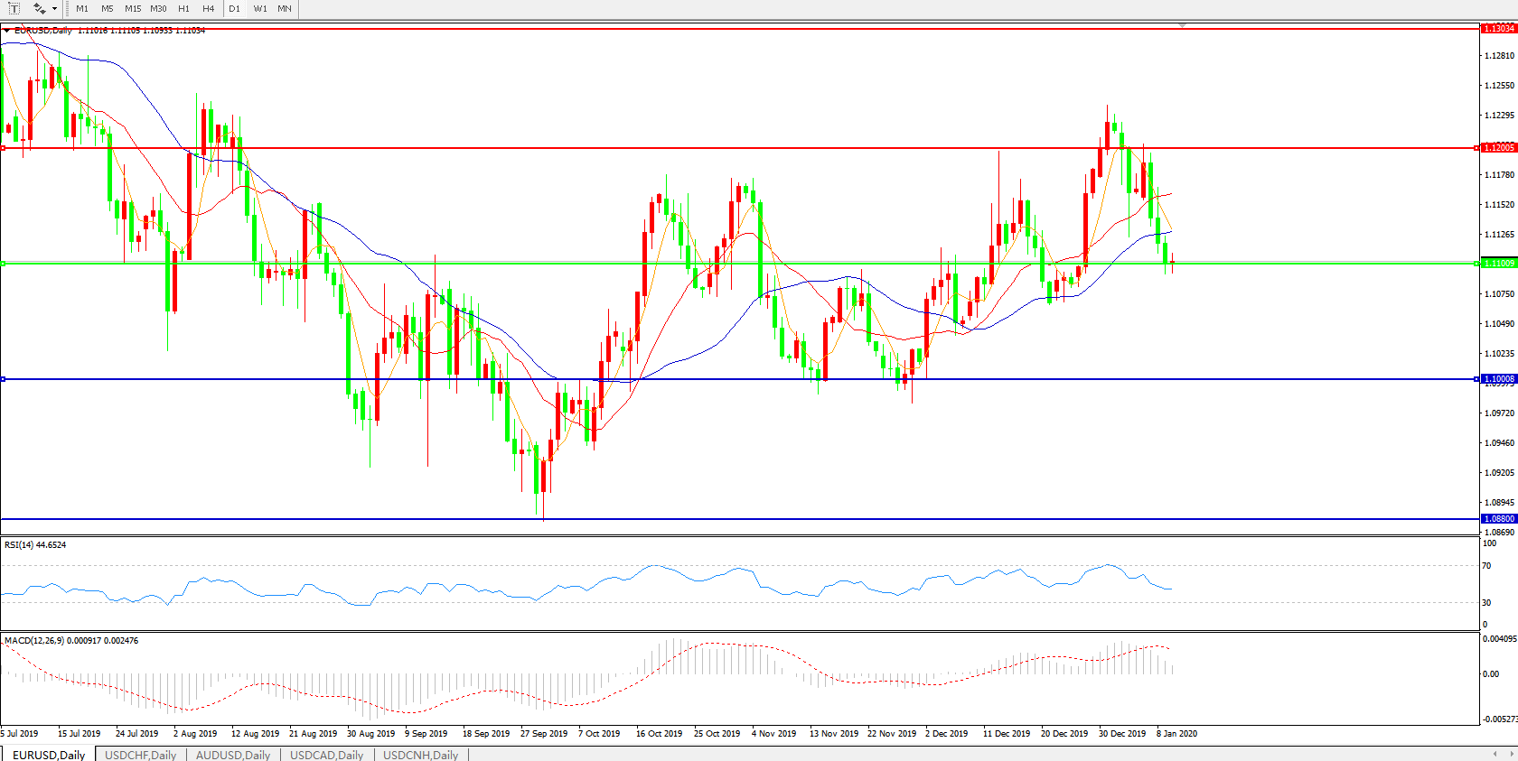 技术面简析:日图短期均线开始形成死叉,汇价延续近期弱势继续下行,目前徘徊于1.11关口MACD开始下行且量能快速萎缩 RSI缓步走低,预计汇价大概率将弱势整理,重点关注下方1.11关口的支撑