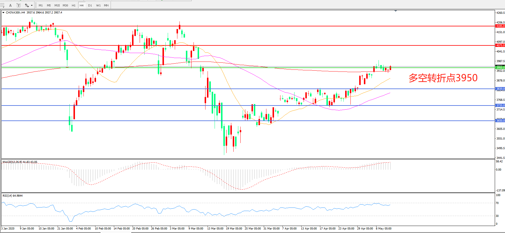 4小时图看,沪深300延续高位震荡,波幅不大,日内虽有震荡,但始终站在200均线之上, MACD红柱增加,RSI指标走平,日内延续上行概率较大。