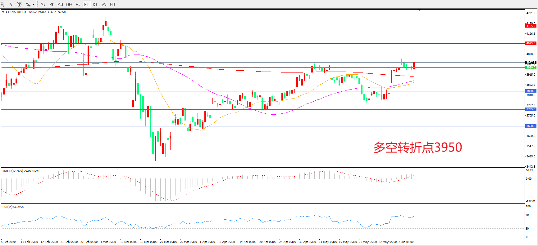 4小时图看,沪深300延续高位震荡,逐渐站稳3950一线,均线系统粘合,形成下方支撑, MACD红柱增加,RSI指标向上,日内延续上行概率较大。