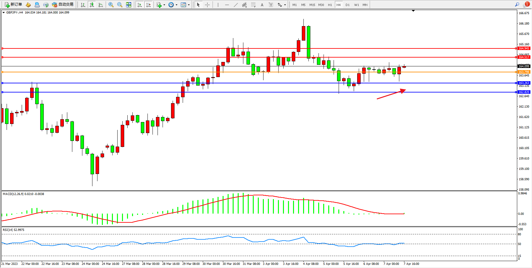 4小时图看:高位短期整理,市场整体平缓上移,短期看涨情绪逐渐涌现,MACD指标处于0轴线附近徘徊,RSI指标处于50均衡线附近弱势徘徊;