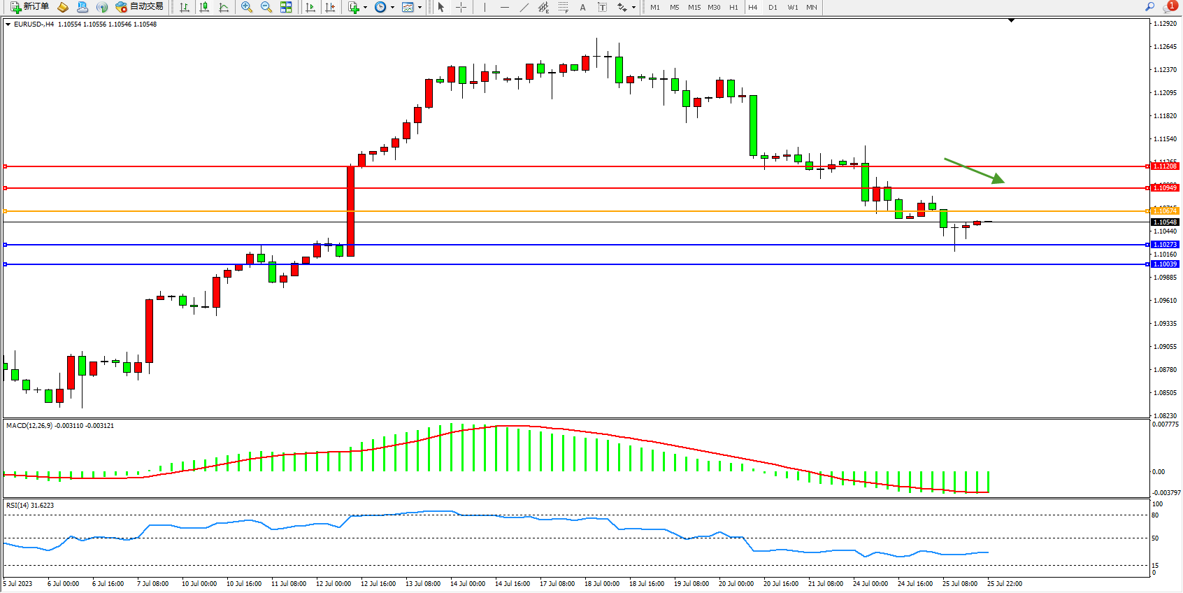 4小时图看:空头动力维持震荡不断向下移动,短期跌势或将持续,市场整体空头情绪笼罩,MACD指标处于空头区域维持整理,RSI指标处于空头区域低位震荡;