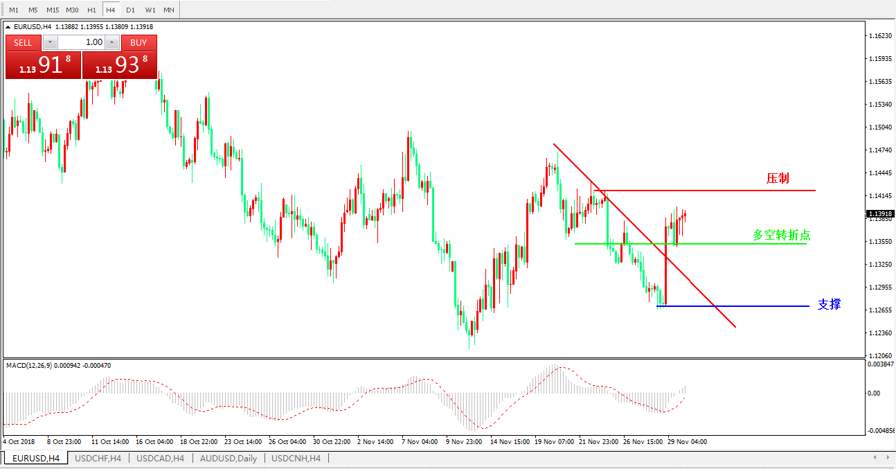 技术面简析:H4周期显示,汇价强势击穿下行趋势线,MACD动能柱开始放量,有望延续升势。