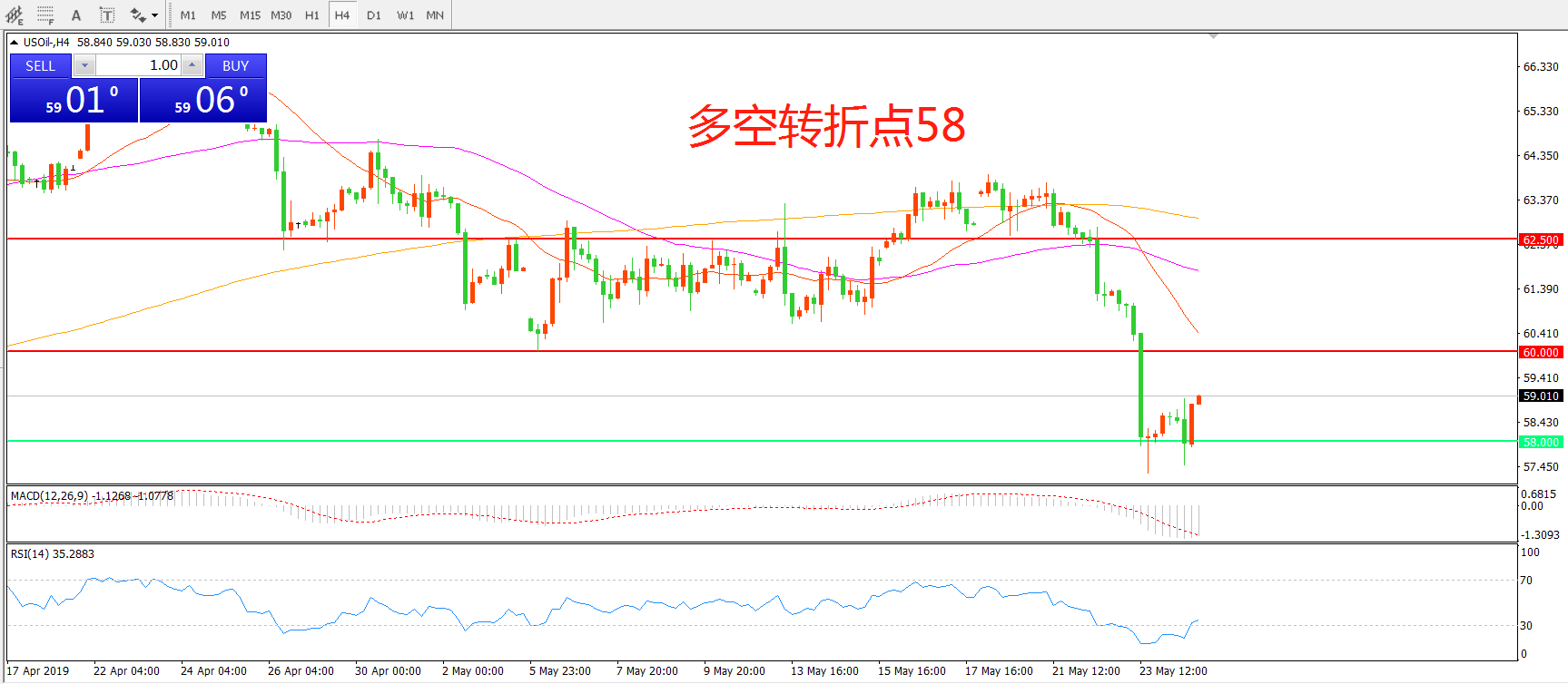 4小时图看,油价大跌后触及58美金获得支撑,短期反弹走势相对完好, MACD绿柱减少, RSI有拐头迹象,日内以震荡上行思路为主,重点关注上方60美金附近得失。